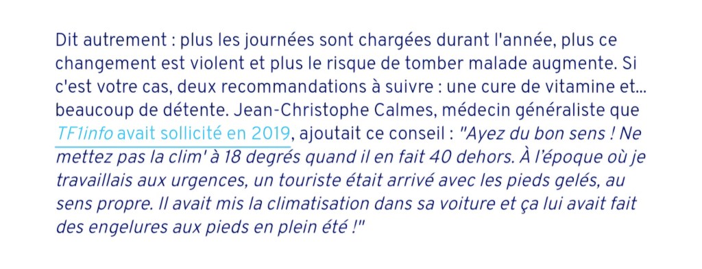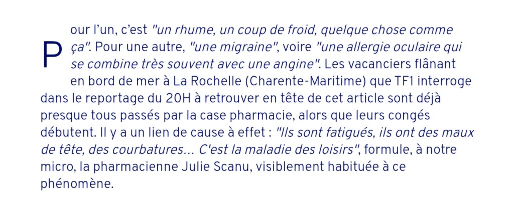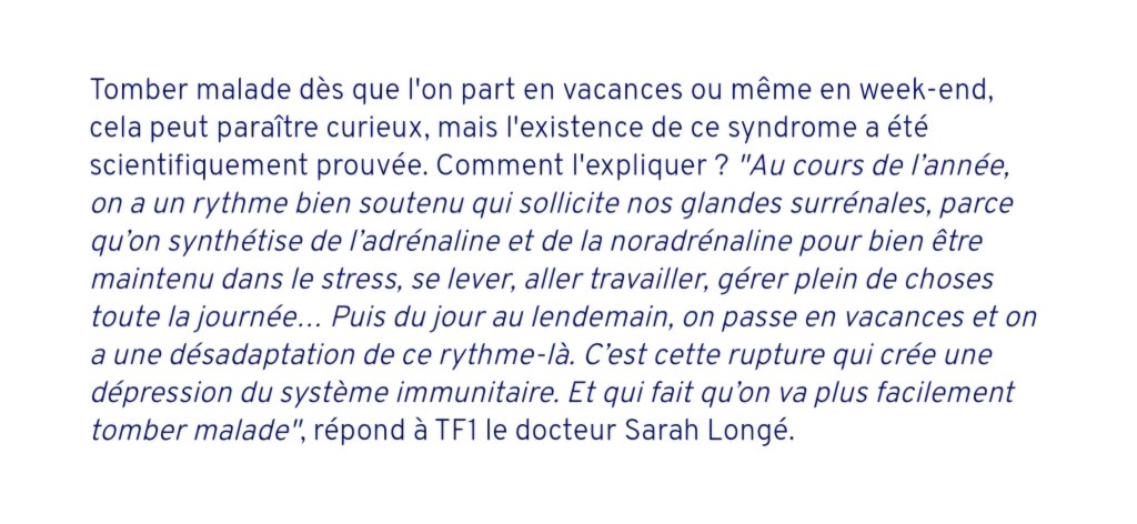 Connaissez-vous la « maladie des loisirs » ? Le conseil : beaucoup de détente ! (Voir les captures d’écran ci-dessous. Reportage Tf1.) J’ajouterais : tout au long de l’année ! Se faire masser régulièrement renforce votre système immunitaire !