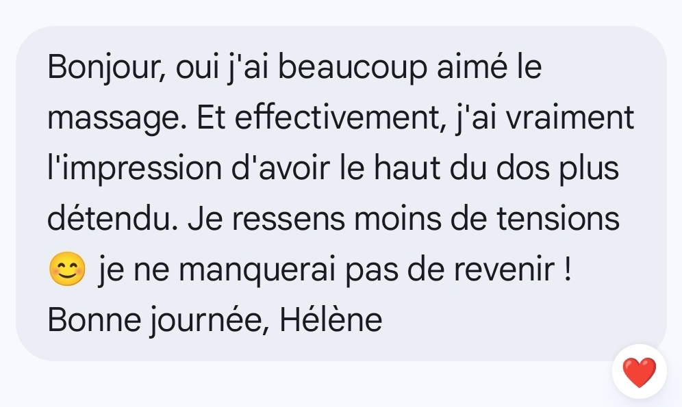 - Bien se préparer à un massage, pour mieux en profiterVoici quelques conseils afin de bien vous préparer à votre massage bien-être, et à en profiter pleinement ! Avant votre première séance, un petit questionnaire vous sera envoyé, lors de votre prise de RDV. Il sera à remplir et à m’envoyer avant votre RDV. Il s’agit d’un petit questionnaire sur votre santé, vos attentes, vos… Lire la suite : Bien se préparer à un massage, pour mieux en profiter