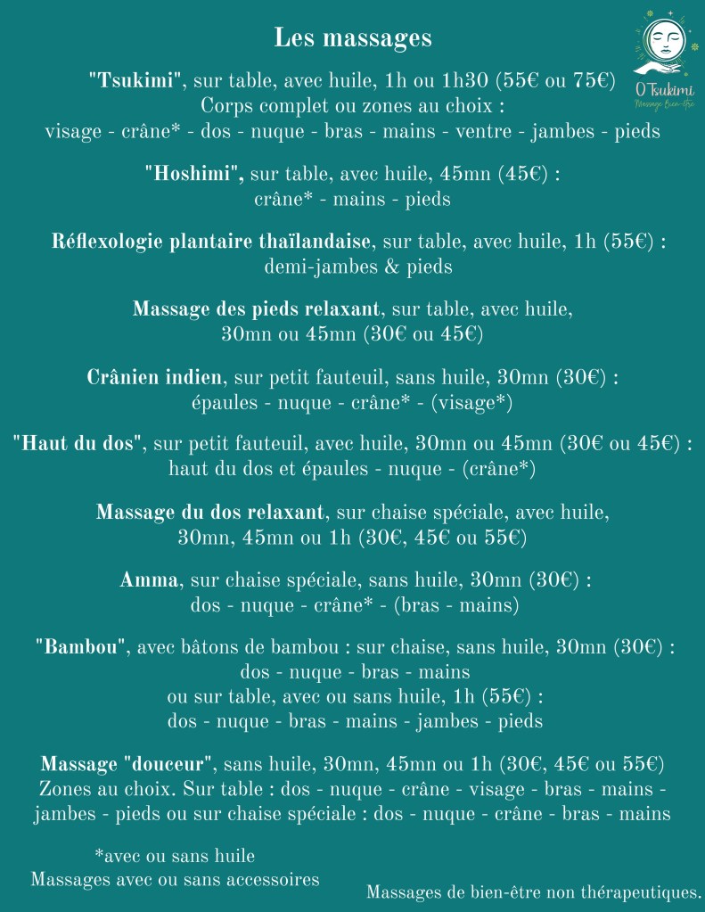 - Le massage TsukimiLe massage « Tsukimi », le massage signature Magali O Tsukimi, est un massage du corps mélangeant douceur et fermeté, un massage enveloppant et fluide. (Massage californien amélioré avec d’autres techniques issues d’autres massages.) Un massage complet, relaxant et déstressant, réalisé sur mesure, selon vos soucis de santé, besoins, envies et préférences. Vous pouvez choisir les zones… Lire la suite : Le massage Tsukimi