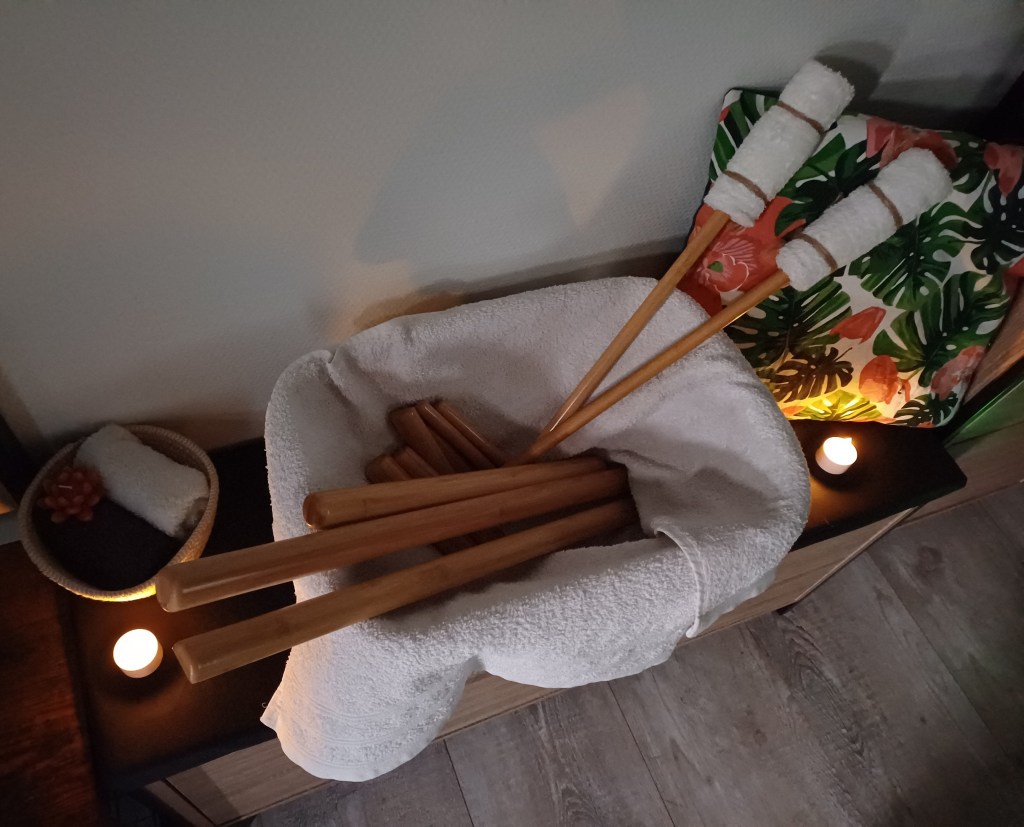 Massage par roulements, glissements, mouvements circulaires, points de pression et percussions. (Différentes tailles, formes et diamètres de bambou afin de s’adapter à toutes les zones du corps.)