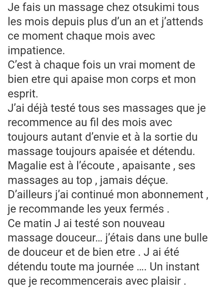- Pourquoi se faire masser chez Magali, O Tsukimi – Massage bien-être ?Chez Magali, O Tsukimi – Massage bien-être : • Votre santé, vos besoins, vos attentes et préférences sont pris en compte (et des conseils vous sont parfois donnés) : massages sur mesure. • Un accompagnement par un programme personnalisé adapté à vos besoins vous est proposé, si vous le souhaitez. • Massages de qualité, complets,… Lire la suite : Pourquoi se faire masser chez Magali, O Tsukimi – Massage bien-être ?