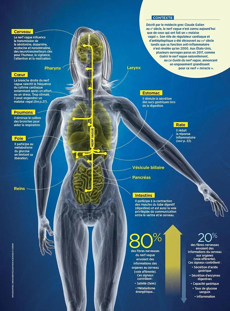 Le frein vagal, nerf vague : il va du cerveau jusqu’au stimulateur cardiaque de notre coeur et agit comme un frein sur notre rythme cardiaque.