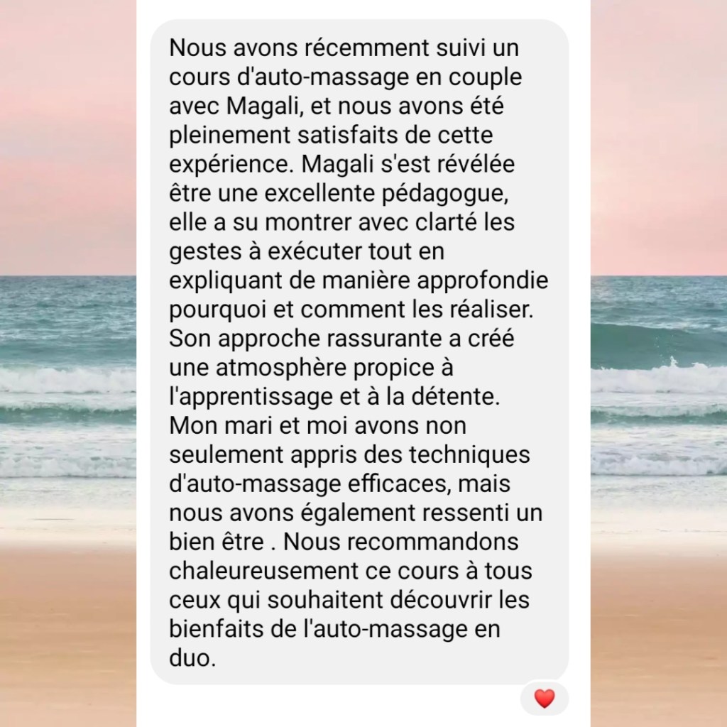 Après l’atelier, un livret de cours est envoyé par mail avec des informations, des explications, des conseils et le protocole de l’automassage + le petit cours d’anatomie. (PDF)