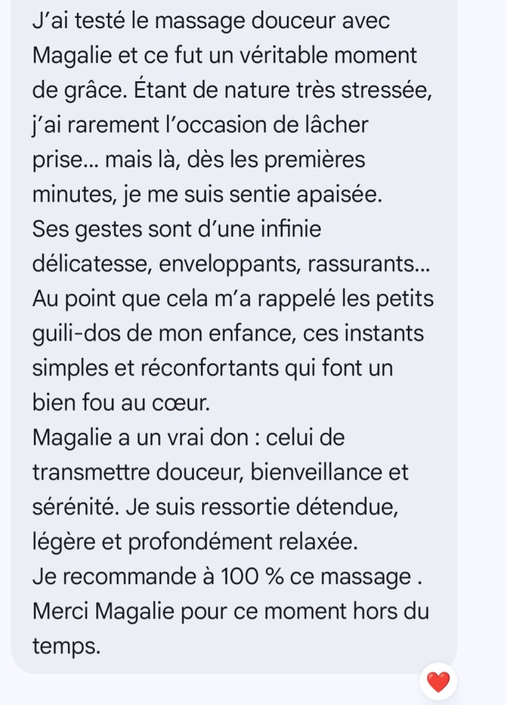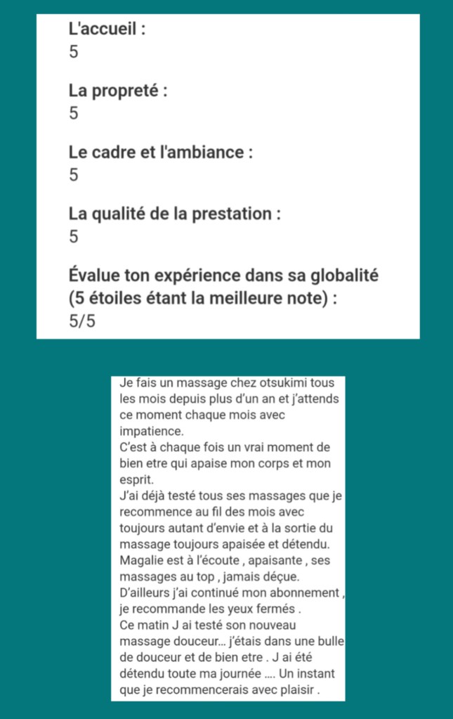 Chères clientes, vous pouvez rédiger votre avis sur ma fiche Google et/ou sur mon site Internet : https://otsukimimassagebienetre.fr/je-donne-mon-avis/. Je vous en remercie par avance.