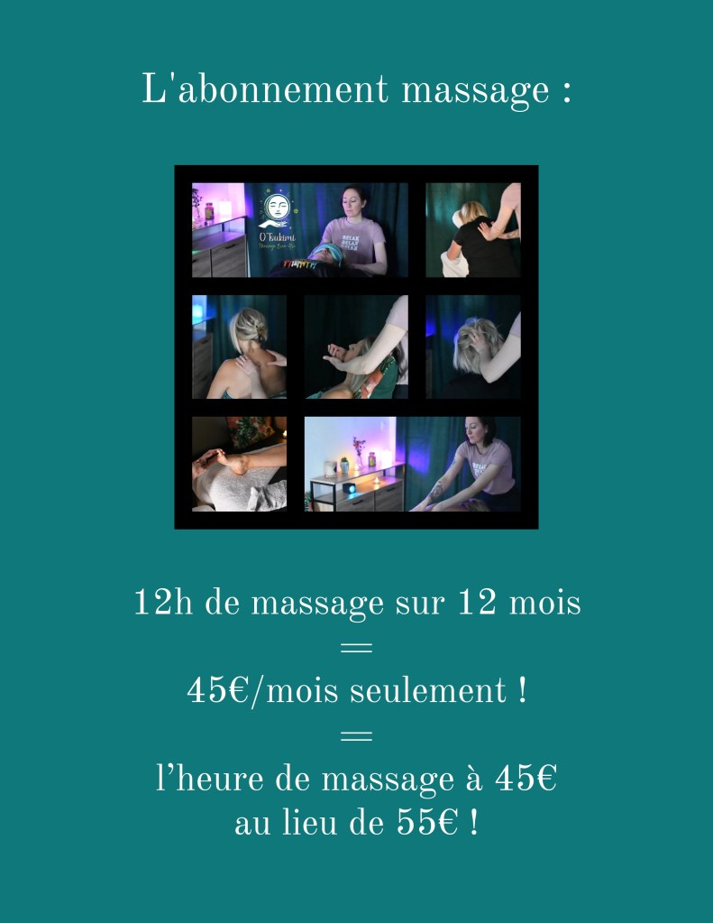 Tu es souvent stressée ou anxieuse, tu as régulièrement des tensions et des douleurs, un manque de sommeil, d’énergie, ou tu as juste besoin de te relaxer et de prendre du temps pour toi plus souvent, ou tu adores tout simplement te faire masser ? Fais des économies grâce à l’abonnement massage !